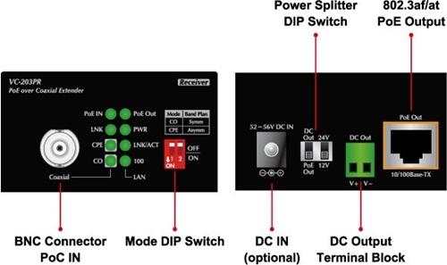 - VC-203PR: 1-Port 10/100TX PoE PSE + 1-Port BNC PoE over Coaxial PD Extender – Receiver