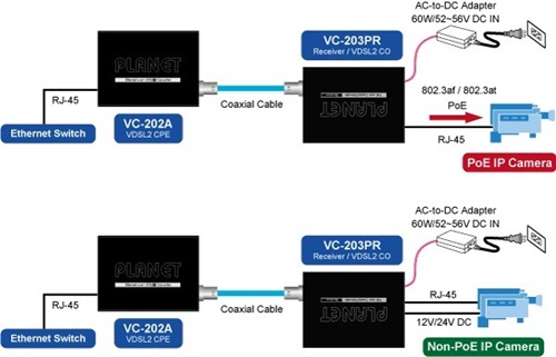 PLANET VC-203Px PoE over Coaxial Extender series is designed to extend IP Ethernet transmission and inject power over an existing coaxial cable for distance up to 1000m (3280ft) to PoE IP camera, PoE wireless AP and any 802.3af/at complied powered device (PD).