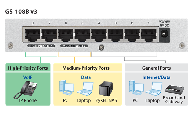 - QoS ports for optimized, smooth VoIP and data transfer of high- and medium-priority applications