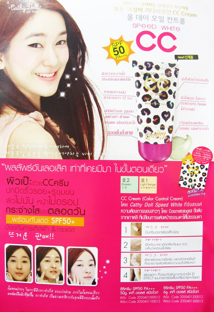 งซับมันกันทั้งวัน ขอแนะนำ.... ใหม่ล่าสุดกับ Skin Care ที่มาในรูปแบบ Make Up ที่จะเผยผิวขาวที่สุดที่จะขาวได้ปรับสีผิวที่ไม่สม่ำเสมอให้เรียบเนียนใส ทั่วใบหน้ากับสุดยอดนวัตกรรมใหม่ของ CC Cream (Color Control Cream) โดย Cathy Doll Speed White ที่รังสรรค์ความต้องการของสาว ๆ โดย Cosmetologist ชื่อดังจากเกาหลีที่เปลี