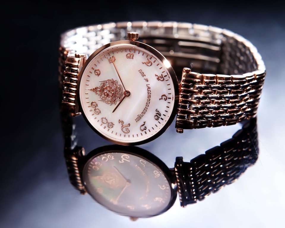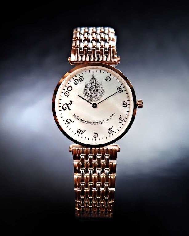 นาฬิกาข้อมือแสตนเลส เรือนบางเฉียบ พร้อมตราสัญญาลักษณ์ 84 พรรษา หน้าปัดมุกแท้ 7 สี