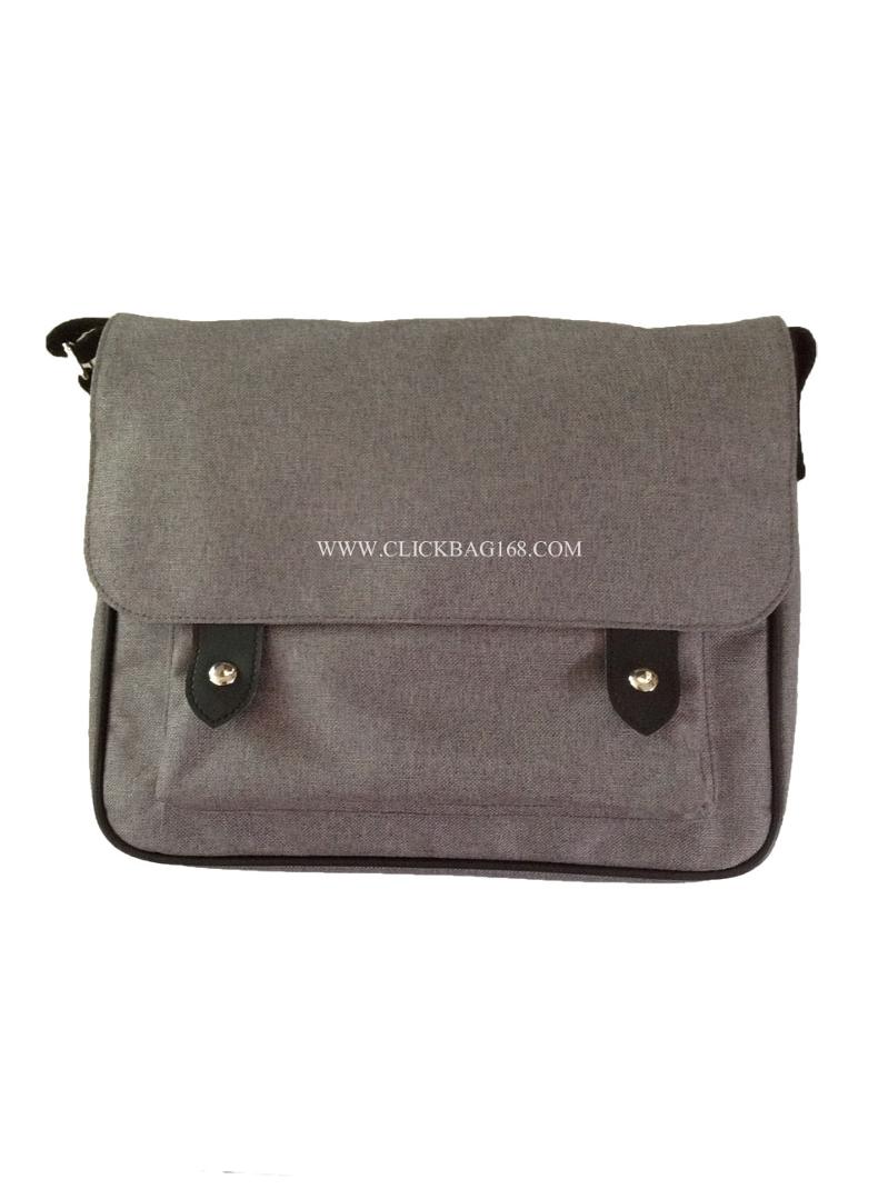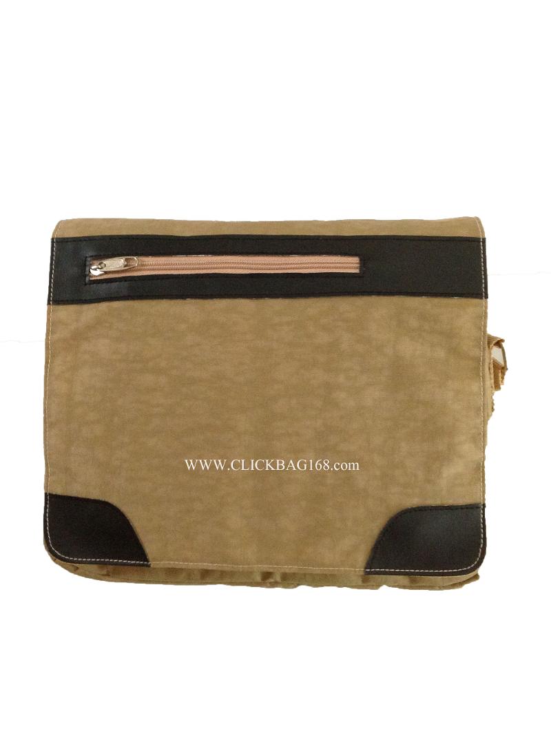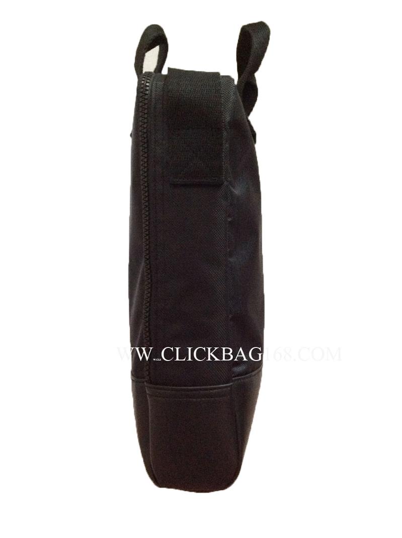 ผ้าไนลอน น้ำหนักเบา ช่องกระเป๋าด้านหน้าติดกระดุมแป๊ก มีหูหิ้วและสายสะพายถอดได้ ขนาด กว้าง 2