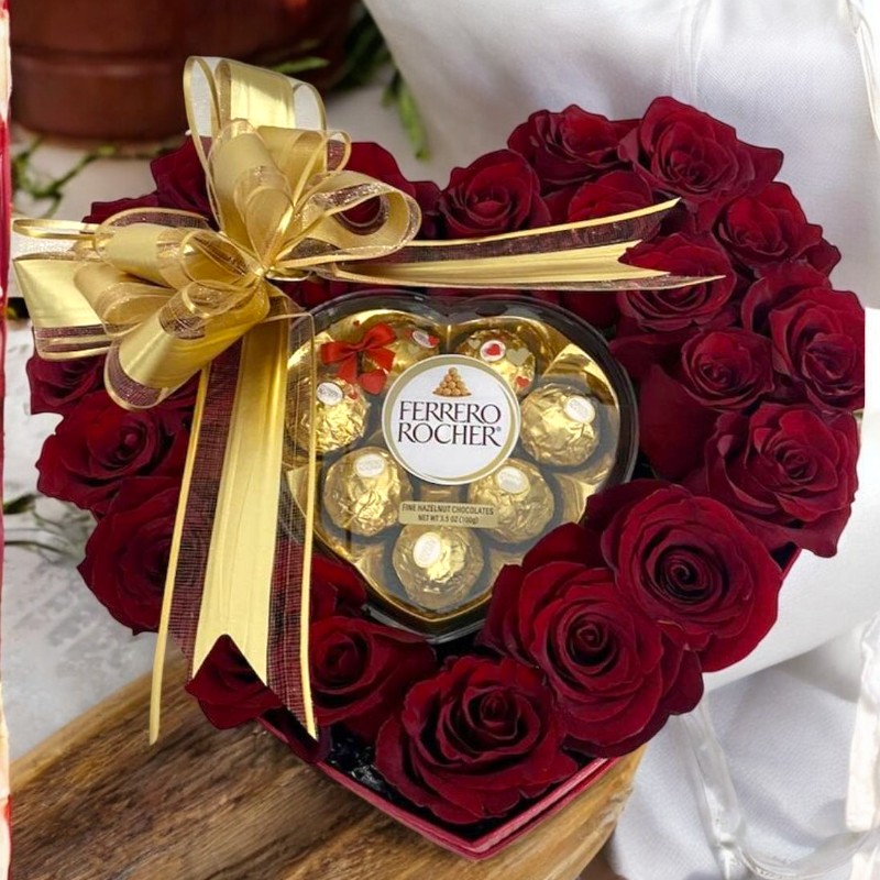 กล่องหัวใจ ดอกกุหลาบแดง ตุ๊กตาหมี+เฟอเรโร่ 1 กล่อง 24 ลูก