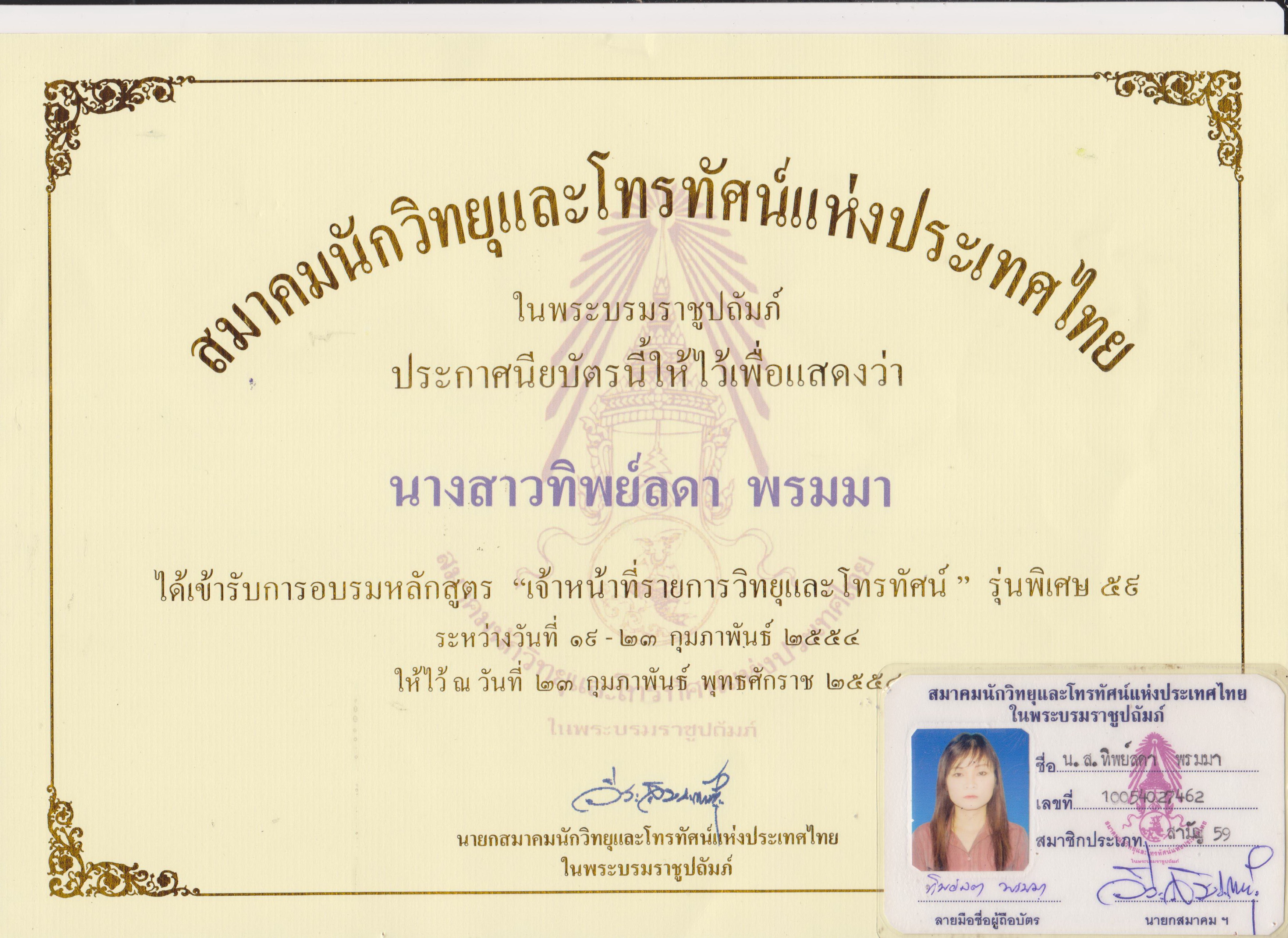 - (ผ่านการอบรมจากสมาคมนักวิทยุและโทรทัศน์แห่งประเทศไทย